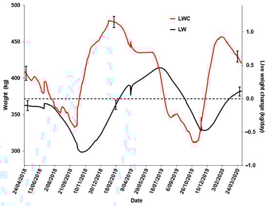 Satellite imagery with high a spatial and temporal resolution allows the calculation of VIs, which can be correlated to pasture quantity and quality [3,4]. The growth and weight of cows are of interest because they impact cows’ reproductive efficiency, including their ability to conceive, gestate, and raise a calf to weaning [5,6]. Cow and calf loss in extensive systems is responsible for large productivity losses, with the live weight of cows believed to impact the extent of calf loss in these systems [6]. Cattle live weight change (LWC) can also be measured using remote automatic weighing systems [7,8]. This information could be useful to integrate with remotely sensed VIs. However, no studies have been published integrating data streams from the remote monitoring of both vegetation and cattle LWC in extensive systems. Such information could then be used to assess the relationship between these variables throughout the seasons. It could also be used to manage animals in regard to nutrition, through paddock change, and feed supplementation. Mating and weaning strategies, amongst others [8], could also benefit from this information.
