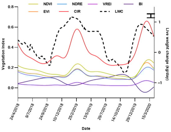 These VIs were used to assess the relationship with LWC of animals in the present study. The value of VIs typically represented the density or quantity of green forage available in the trial paddock. Different indices often represented different aspects of vegetation or complemented each other in terms of their sensitivity to prevailing vegetation and soil reflectance. Therefore, a suite of VIs was assessed in the present study to determine their association with LWC and LW (Table 2). As an example, NDVI and VREI were chlorophyll sensitive [21], but NDVI often saturated at high levels of green vegetation and was impacted more by soil and shadow. In contrast, EVI addressed some of these issues and often had reduced interference from soil and atmospheric noise [27]. Similarly, NDRE is known to be more accurate for use in mid to late season biomass and tree crops, and was less likely to oversaturate compared to NDVI [28]. The BI was useful for improving the identification of bare soil areas [25], which were especially common in areas of high cattle traffic activity, such as water and supplement points. The CIr is commonly used to assess vegetation, as its combination of bands shows vegetation to appear red, giving different hues of the colour to show healthy or sparse areas of vegetation [22,23].