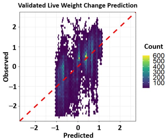 Machine learning random forest modelling results predicted the growth of breeding cows using leave-one-month-out cross-validation from VIs, rainfall, day, month, and year of the trial period, with an LCCC of 0.62 when testing with LOMOCV (Table 5). The density plot of the observed vs. predicted LWC showed that many points were poorly predicted; however, a higher density of points fell along the 1:1 line (Figure 4).
