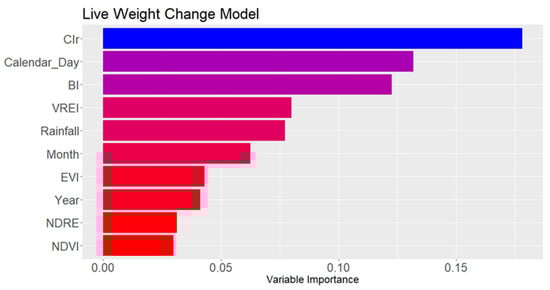 The strong relationships between VIs and animal performance demonstrate the importance of vegetation quality and quantity in extensive production systems. Despite the broad range of studies in which machine learning has been utilised for beef [37,38,39] and dairy cattle [40], to date, there are no studies which incorporate the use of VIs to explain the LWC of animals under commercial conditions of northern Australia. In addition to the VIs presented, other VIs were also used in the preliminary analysis, but not included in the paper due to their low correlation with the LWC. These included the Canopy Chlorophyl Content Index (CCCI) [41], Modified Soil-Adjusted VI (MSAVI) [42], Normalized Difference Moisture Index (NDMI) [43], and Modified Chlorophyll Absorption Ratio Index (MCARI) [44]. Furthermore, CIr seemed to be the most suitable VI to predict animal performance due to its greatest importance in the random forest model.