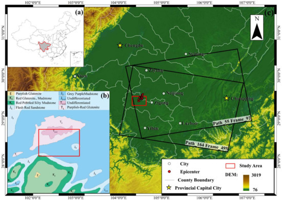 (a) Location of the study area in China; (b) Geological map of the study area (Modified from [21]); (c) map of the study area and the image coverage, superposed on the ALOS DEM.