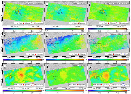 In Figure 3d–f, the image of the study area is affected by vegetation, resulting in poor coherence. During the image time span, an Mw 4.3 and an Mw 4.0 earthquake occurred in the area. In the original interferogram, the displacement caused by these earthquakes is blurred. The STD of the original interferogram is 1.54 cm, and decreases to 0.63 cm after GACOS correction. The maximum displacement is about 4 cm, which obviously is caused by artifacts (circled in Figure 3f), as the area with maximum displacement is far away from the fault and epicenter. The focal depths of the Mw 4.3 and Mw 4 earthquakes are 7 km and 11 km, respectively, and epicenters are about 1 km to the east of the fault.