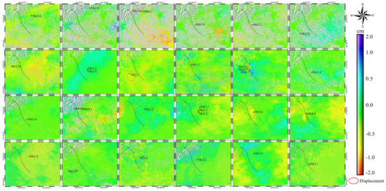 In Figure 3g–i, the images of the study area have good coherence. During the image time span, an Mw 4.4 earthquake occurred on 16 February 2020 in this area and caused obvious subsidence. The STD of the original interferogram is 0.45 cm, decreasing to 0.26 cm after GACOS correction, and the maximum displacement is about 2.5 cm. The focal depth is 10 km, and the epicenter is less than 1 km east of the fault. It should be noted that there are several areas with visible displacement marked with blue circle in Figure 3. Judging from the location and the displacement pattern, these are some residual errors (circled in the Figure 3f,i) in the D-InSAR processing, which are not counted as displacement for the earthquake.