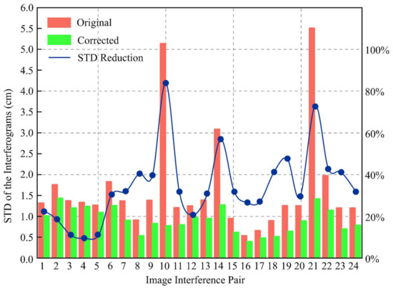 Figure 5 shows that the phase standard deviation after correction is significantly reduced compared with that before correction, indicating that GACOS has a significant effect in correcting the atmospheric delay in the area.