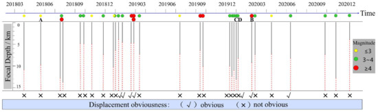 The earthquake magnitude, focal depth and earthquake occurrence time are shown in Figure 6. The focal depths of these earthquakes are all less than 15 km, and 7 of the 31 earthquakes have magnitudes larger than 4. The Mw > 4 earthquakes show obvious displacement in the results. It should be noted that earthquakes in 24 February 2019 (Mw 4.7), 25 February 2019 (Mw 4.3) and 25 February 2019 (Mw 4.9) are in an interferogram, therefore the results are displayed on one image; not all Mw < 4 events have visible displacements on InSAR data. There may be various reasons for this, not only depth, but also focal mechanism. In Figure 6, A and B are two earthquakes with the same focal depth but the magnitude of A is smaller than that of B. Thus, B has some deformation but A has no deformation. The comparative analysis shows that, when the focal depths are the same, the larger the magnitude, the more obvious the earthquake displacement. Besides, Earthquake C and D have the same magnitude, but the focal depth of C is larger than that of D. Thus, D has some deformation, but C has no deformation. So we conclude that when the magnitudes are the same, the shallower the focal depths the more obvious the earthquake displacement. The influence of distance from fault on deformation is not considered here.