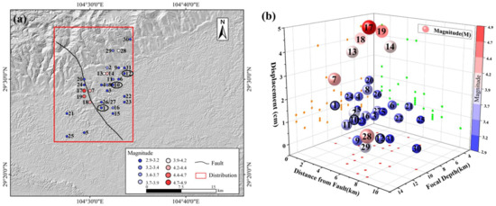 (a) Earthquake spatial distribution; (b) the correlation between surface displacements, earthquake magnitude, focal depth and distance from fault.