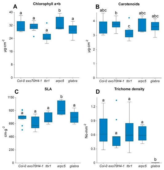 Leaf biochemical and structural parameters for A. thaliana lineages (Col-0, exo70H4-1, tbr1, arpc5, and glabra): (A) chlorophyll a + b content, (B) carotenoids content, (C) specific leaf area (SLA), and (D) trichome density. Differences among lineages were tested by one-way ANOVA. In the case of normal distribution, the Tukey–Kramer multiple comparison test was used; otherwise, the Kruskal–Wallis test was applied. Significance was set at a p-value < 0.05. Lines in boxes show median, bars show the inter-quartile range, and dots correspond to outliers.