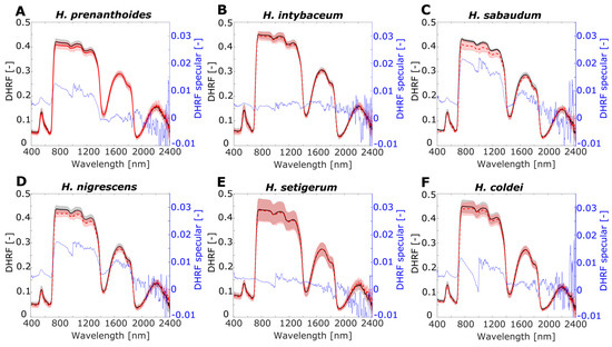 Leaf optical properties averaged for RTOT, RSR, and RSPEC for Hieracium species (A) H. prenanthoides, (B) H. intybaceum, (C) H. sabaudum, (D) H. nigrescens, (E) H. setigerum, and (F) H. coldei. Left y-axis shows directional–hemispherical reflectance factor (DHRF) of RTOT and RSR, and right y-axis corresponds to DHRF of specular component RSPEC. Grey and light red shadows of RTOT and for RSR curves display variance among the samples by standard deviation value. Black axes (left) correspond to DHRF of RTOT, RSR and blue axes (right) correspond to DHRF of RSPEC.