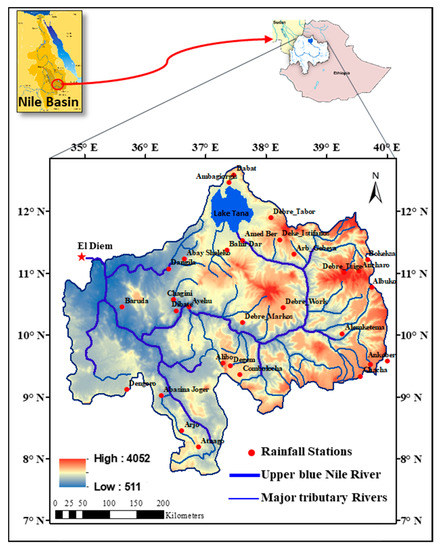 The approach we propose herein was implemented in the UBNRB, which is situated in Western Ethiopia, extends between 7°45′ and 12°45′N and from 34°05′ to 39°45′E, and has an area coverage of about 200,000 km2 (Figure 1). The Blue Nile originates at elevations of about 3000 m; then, it flows 1450 km from its origin at an elevation of 1829 m to reach Sudan with an elevation of 490 m, merging with the White Nile to form the Nile [38] (Figure 1). The river and its substreams have a natural northwest slope in general, but they are steeper in the east than in the west and northeast. During the primary rain season, June–October, almost 84% of the overall rainfall volume is received. On the Sudan–Ethiopia border, the estimated annual streamflow is around 48.660 million m3, exceeding 40% of the overall water resources in Ethiopia. The average annual runoff over the UBNRB is about 46 billion m3 (1456 m3/s), with a runoff ratio of 18% [39]. The rivers of the basin provide the Nile with more than 62% of its overall discharge at Aswan; therefore, the UBNRB is a major and vital water resource for Ethiopia and downstream countries.