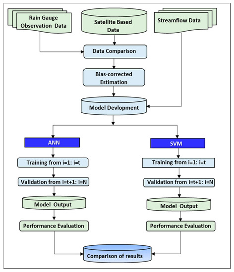 In this study, we attempted to: (1) examine the potential of three commonly used precipitation products with high temporal and spatial resolution, namely Climate Hazards Group Infra-Red Precipitation with Station (CHIRPS, https://developers.google.com/earth-engine/datasets (access on 12 July 2020)), African Rainfall Climatology (RFE 2.0, https://journals.ametsoc.org (access on 12 July 2020)), and Tropical Rainfall Measuring Mission (TRMM-3B42V7, https://climatedataguide.ucar.edu/climate-data/trmm (access on 12 July 2020)); (2) use these products to develop a monthly streamflow forecasting model using ANN and SVM models; and (3) assess the forecasting models’ reliability. To the best of our knowledge, no studies on the application of artificial neural network fuzzy inference system and support vector machine techniques to forecast streamflow using CHIRPS, RFE, and TRMM-3B42V7 rainfall data as inputs in the study area have been carried out to date. The structure of this paper is as follows: following this introduction, Section 2 comprises a detailed methodology and the components of the proposed models. Section 3 presents a detailed comparison between historical rainfall records and satellite product estimates, the case study results, a discussion of ANN- and SVM-based forecasts, and their applications in streamflow forecasting. Finally, a discussion and concluding remarks are presented in Section 4 and Section 5, respectively.