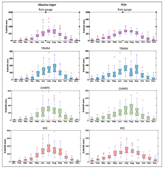Box plots of monthly rainfall distributions for the satellite products and gauge records at the Abasina Joger and Arjo stations: TRMM-3B42V7 from 1998 to 2014, CHIRPS from 1981 to 2014, and RFE from 1983 to 2014.