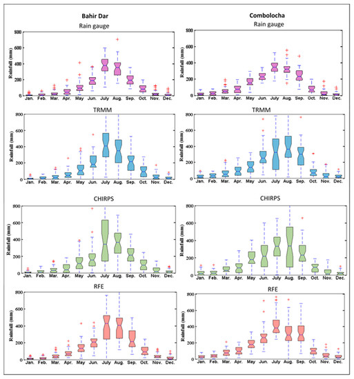 Box plots of monthly rainfall distributions for the satellite products and gauge records at the Bahir Dar and Combolocha stations: TRMM-3B42V7 from 1998 to 2014, CHIRPS from 1981 to 2014, and RFE from 1983 to 2014.
