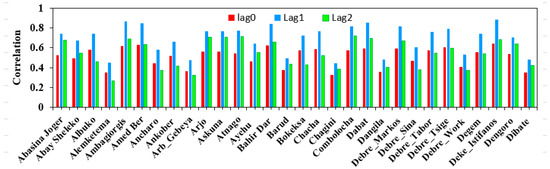 The results of the correlation analysis between the rainfall records of the investigated stations and the monthly streamflow of the upper Blue Nile River at El Diem station, at various lags at a monthly scale, revealed significant correlations. Since this study was aimed at forecasting the streamflow at a given time based on previous data on rainfall, we were mainly interested in the negative lags. Therefore, the correlation of rainfall records with streamflow was calculated at lag time t (lag 0), t-1(lag 1), and t-2 (lag 2), as shown in Figure 7. Figure 7 shows that the correlation at some stations is much closer than at others. It is evident that the rainfall of all the gauge stations at time t-1 has the strongest relationship, which is almost around 0.74 with river flow at time t. In general, all historical rainfall records and, consequently, the corresponding precipitation products in UBNRB, along with previous streamflow measurements at El Diem station, can be feasibly used as an input for ANN and SVM models to forecast streamflow. Stations with a correlation coefficient of more than 0.75 were used as inputs for the forecasting models.