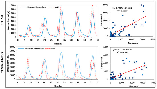 ANN test results of the simulated monthly streamflow at El Diem station based on TRMM-3B42V7 and RFE 2.0 data.