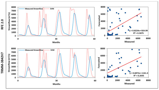 SVM test results of the simulated monthly streamflow at El Diem station based on TRMM-3B42V7 and RFE 2.0 data.