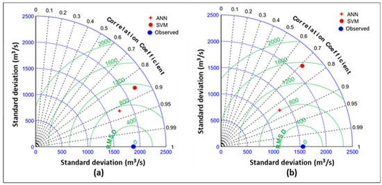 Taylor diagram for the ANN and SVM compared to the observed data: (a) training; (b) testing.