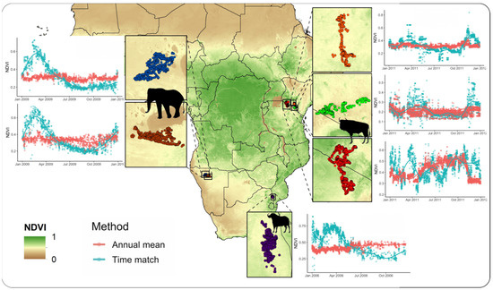 To showcase the potential benefits of pairing tracking data with the time at which images were acquired, we compared NDVI values extracted using the method described above with NDVI values extracted for all animal locations from an annual mean NDVI image calculated from all the MODIS images available for the year of each tracking dataset. We plotted the NDVI values against time for each animal and for each method (mean annual NDVI and time-matched NDVI) for a visual comparison.