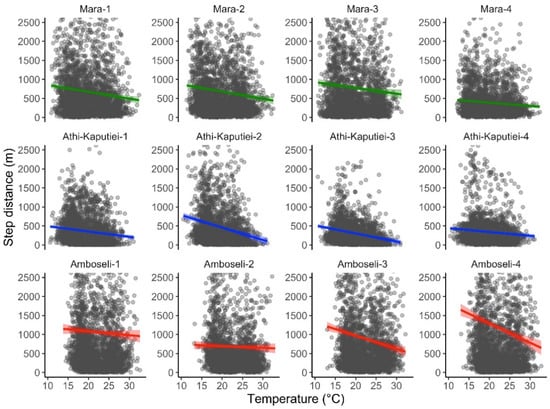 Relationship between step length and air temperature for blue wildebeest. GPS tracking data were obtained from 12 individuals from three populations in Kenya: the Maasai Mara/Loita Plains (green), Athi-Kaputiei Plains (blue), and Amboseli Basin (red). Hourly air temperature at 2 m over the ground was obtained from the ERA5-Land dataset. All data are from 2011.