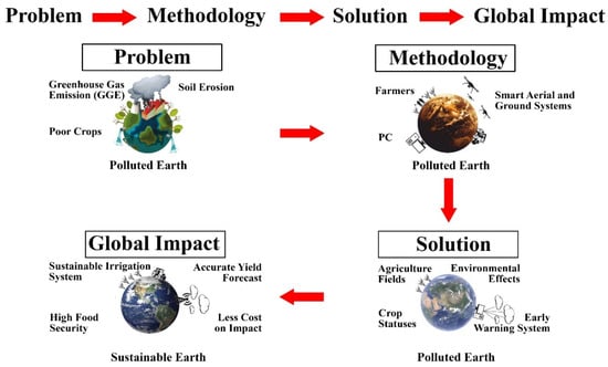 The graphical abstract visualizes the remote-sensing technology that perfectly addresses crop water stress using crop statistics and computer software by (1) identifying the problem, (2) implementing the methodology, (3) delivering the solution, and (4) addressing global crop water stress.