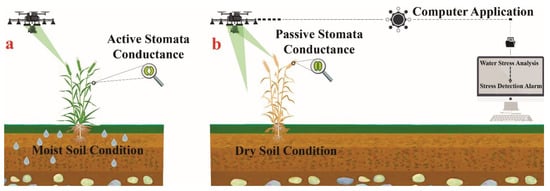 An optical sensing system can be used for the detection of various crop stress–resistance mechanisms [97]. Vegetation crops have benefited from such mechanisms in avoiding crop water stress. One such mechanism is stomatal conductance (opening and closure), which can be monitored. This system shows that conductance decreases after a systemic response commanded by root system signals under a particular stress condition. This process leads to the closure of the stomata [107]. During crop water stress, stomatal conductance in the optical sensor system appears to be closed as leaves experience water stress, particularly when the leaf water potential decreases below a certain threshold [108].