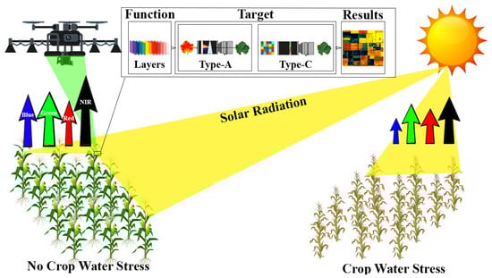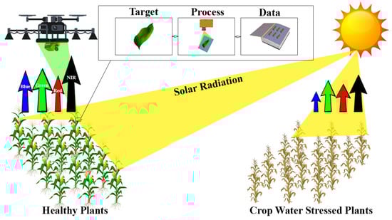 Studies show that remote–sensing systems provide a precise analysis of deep machine learning [2,77,78], which comes from the target object and evaluates photosynthetic, biotic, abiotic, and nutrient processes using both passive and active methods to monitor crop water stress [79]. The passive analysis is linked with chlorophyll fluorescence emissions and is considered a good indicator of the photosynthetic potential. Passive methods are used to measure the sun–induced chlorophyll fluorescence (SIF) that is produced from the vegetation source in the form of a photosynthetic light reaction after sunlight is absorbed by the leaf. This provides a direct assessment of the photosynthetic process [80] and spectral resolution data [81]. They are based on the total emitted fluorescence values, but the values acquired by SIF are lower in field conditions. SIF ranges from 1.0 to 3.5% of the shortwave energy gained from solar radiation and is determined in a specific spectral wavelength with a shorter amount of solar irradiation values [82].