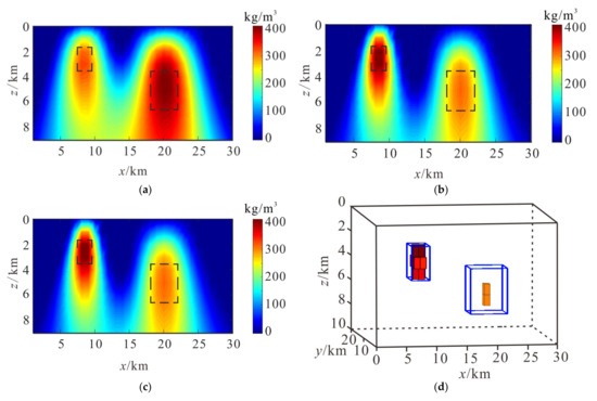 We obtain the density results with a slice of y = 10 km and the 3D density distribution with larger than 370 kg/m3 computed by the data combined joint inversion method as shown in Figure 7a,b. The density results are not focused enough and cannot describe the distribution of models clearly. The density results with a slice of y = 10 km and the 3D density distribution larger than 370 kg/m3 computed by the presented cooperate density-integrated inversion method are shown in Figure 7c,d. Compared to the density results computed by the data combined joint inversion method, the results computed by the presented cooperative inversion method are more convergent, and both horizontal and vertical resolution is higher, and the density distributions are closer to the true value. So, the presented cooperative inversion method can obtain high-resolution results for the models buried at the same depth.