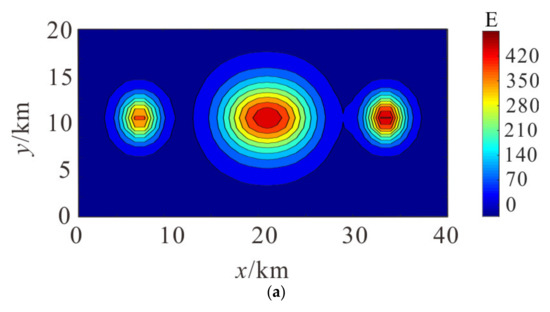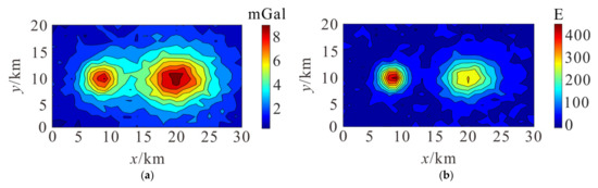 To test the accuracy of the proposed cooperate density-integrated inversion method depends upon the airborne’s height, we build the same complex model in Figure 10a. With the airborne’s height increase, the maximum of gravity and its vertical gradient data reduce significantly, and the characteristics are very different from the form in Figure 10b,c.
