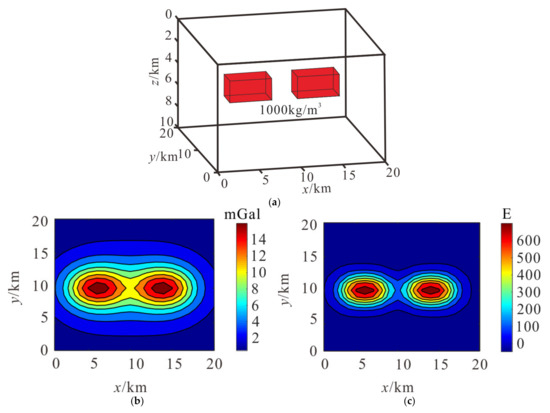 For testing the universality of the proposed method, we build models with two prisms buried at the same depth, and the density contrast of the prism is 1000 kg/m3, which have depths from 2 to 4 km, and the size of models are 4 × 2 × 2 km and 4 × 2 × 2 km, as shown in Figure 6a. The airborne gravity anomaly and gravity gradient anomaly are as shown in Figure 6b,c.