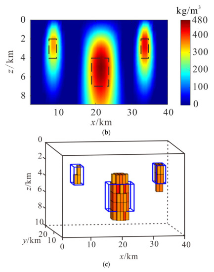 In actual situations, the distributions of iron mines are complex. To verify the acceptability of the proposed method under the actual situation, we build complex models with three prisms, and the density contrasts of the prisms are 800, 1000, and 1200 kg/m3, which have depths from 2 to 4 km, 4 to 7 km, and 2 to 4 km, as shown in Figure 8a, and the sizes of models are 4 × 4 × 2 km, 6 × 2 × 3 km, and 4 × 4 × 2 km. The airborne gravity anomaly and gravity gradient anomaly are as shown in Figure 8b,c.