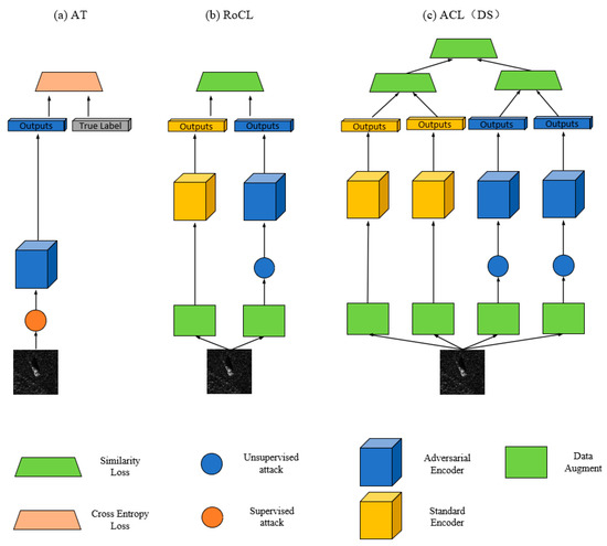 Illustration of workflow comparison: (a) AT; (b) RoCL; (c) ACL(DS). Note that RoCL and ACL(DS) share all weights; however, adversarial and standard encoders use independent BN parameters.