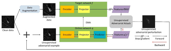 Unsupervised adversarial contrastive learning (UACL) aims to pretrain a robust DNN that can be used in target recognition tasks by adversarial self-supervised learning. As shown in Figure 4, the framework of UACL consists of a target network, f, with parameter ξ and an online network, q, with parameter θ. The online network consists of three parts: an encoder, a projector, and a predictor, while the target network does not have a predictor. Specifically, the encoder is a DNN (ResNet-18 excluding the fully connected (FC) layer by default) that can represent SAR image effectively. The projector and predictor are multi-layer perceptron (MLP) made up of a linear layer, followed by batch normalization (BN), rectified linear units (ReLU), and a final linear layer that outputs a 256-dimensional feature vector. The data argumentation contains random cropping, random color distortion, random flip, and Gaussian blur.