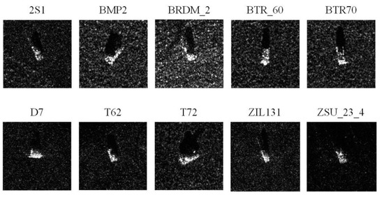 (1) MSTAR [4] Dataset: MSTAR was produced by the US Defense Advanced Research Projects Agency using high-resolution spotlight SAR to collect SAR images of various Soviet military vehicles. The collection conditions for the MSTAR images are divided into two types: standard operating condition (SOC) and extended operating condition (EOC). In this article, we use SAR images collected by SOC, whose details are as shown in Table 1. The dataset includes ten target classes with different sizes. To simplify recognition, we resized the images to 128 × 128. The training dataset was collected at a 17° imaging side view, and the test dataset was collected at a 15° imaging side view [14]. Figure 5 shows example images for each of the classes in MSTAR.