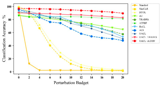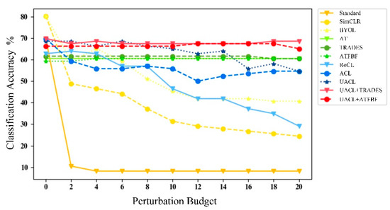 To further research the relation between attack strength and robust accuracy, we utilized a standard adversarial attack ( PGD) with different attack strengths to attack the DNN models. As shown in Figure 7 and Figure 8, adversarial contrastive pretraining defenses, especially UACL, behave better than AT-based defense methods against attacks with low strength. AT-based defense methods can maintain steady robust accuracy as attack strength increases. UACL combined with AT-based defense can lead to stable and excellent robust accuracy in all attack strengths.