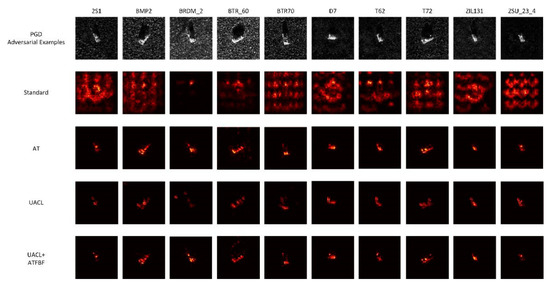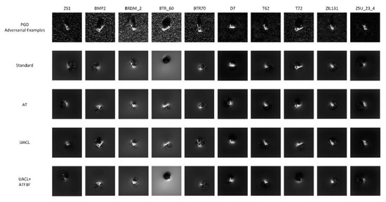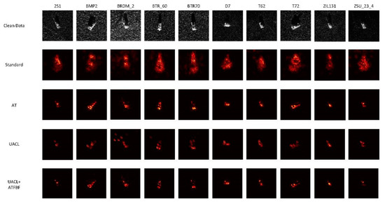 The classification results of adversarial defenses against standard attack are presented in Table 9 and Table 10. Models with defense are significantly more robust than no-defense models. AT-based defenses obtain stable adversarial accuracy, especially in the face of perturbations with significant power. Their robust accuracy decreases very little, but this is at the expense of standard accuracy. Adversarial contrastive pretraining defenses can improve robustness and hardly reduce standard accuracy. This low-cost method for enhancing model robustness has potential in SAR target recognition tasks. Compared with a standard model, UACL increases robustness accuracy by 78.90% at the cost of only a 2.56% decline in standard accuracy. Compared with AT-based defense methods, UACL behaves better in the classification of clean data and , adversarial examples, yielding similar robust accuracy in the classification of adversarial examples. Combining UACL with ATFBF can result in the most advanced performance in the classification of both clean data and adversarial examples. Additionally, the results of SimCLR and BYOL are also notable. They can increase the accuracy of clean data and , adversarial examples, demonstrating the potential of utilizing unlabeled data to enhance adversarial robustness.