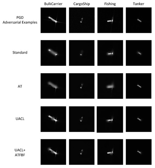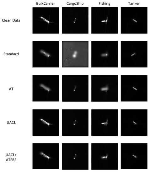 Guided backpropagation images show which part of the image drives the model to make its final prediction. Guided backpropagation images of MSATR and FUSAR-Ship in standard and adversarial settings are shown in Figure 9, Figure 10, Figure 11 and Figure 12. It can be seen that adversarial examples can effectively destroy the activation of the standard model and make the standard model pay attention to the whole region. The activation region of the standard model is larger both in the face of the clean data and in the adversarial examples. The model with defense will pay more attention to the core region of the image, which improves the adversarial robustness of the model. For a model with AT-based defense (AT), a model with adversarial contrastive pretraining (UACL), and a model with composite defenses (UACL+ATFBF), the active area reduces, in turn showing that the latter has a deeper understanding of the realistic significance of the SAR target.