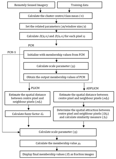 The flowcharts for the execution of the PCM-S, PLICM, and ADPLICM algorithms are presented in Figure 3. To initialize the PLICM and ADPLICM algorithms, the PCM algorithm was used. The supervised versions of the FCM, PCM, FCM-S, FLICM, and ADFLICM algorithms were also implemented for comparative analysis. The modification of unsupervised to supervised classification involved obtaining class centroids from input training data and estimating class memberships in a single step [17].