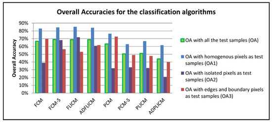 While the choice of reference data and accuracy assessment methods hugely influence the analysis and conclusions drawn from a study, a few specific observations of the results and the accuracy matrices obtained during the scenarios executed in our study are described below. The overall accuracy of FERM and the visual interpretation demonstrated that the three FCM-based local spatial information classifiers (FCM-S, FLICM, and ADFLICM) produced more accurate results, followed by the FCM classifier for classifications with all the six LULC classes. On the contrary, the output quality of the FCM spatial variants degraded significantly in the presence of untrained classes. However, the land cover compositions obtained from the PCM-based local spatial information classifiers were in close agreement with the reality/reference image when a few classes were excluded from training. The three PCM-based local spatial information classifiers (PCM-S, PLICM, and ADPLICM) produced similar RMSE values, which were lower than those of the standard PCM classifier. In other words, the effectiveness of the PCM algorithm in the presence of untrained classes and in handling isolated pixels (noise) was seen to have further improved by incorporating it with local spatial information. While PLICM and ADPLICM were seen to be slightly advantageous in creating accurate land cover class compositions, the empirically set parameter in PCM-S allowed control of the neighborhood effect, depending on the noise intensity in the input image. Among the PCM-based local spatial information classifiers, ADPLICM was seen to preserve maximum image details, such as the ADFLICM of the FCM-based local spatial information classifier.