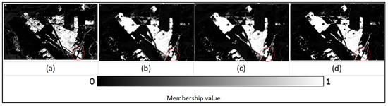 Figure 21. The membership fraction image for the ‘Riverine Sand’ class generated by (a) FCM, (b) FCM-S, (c) PCM, and (d) PCM-S algorithms.