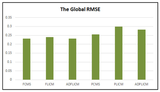 The algorithm parameters, fuzzy factor m , window size, and a (in the case of FCM-S and PCM-S), were initially optimized for the classifiers to exploit their maximum potential. Owing to the disparity in the choice of the optimal value of m in the literature [9,28,29], we followed an experimental strategy to estimate the best possible value of m , in the interval [1.1,3], for which the highest classification accuracy was obtained. The window size and parameter a , in FCM-S and PCM-S, were also optimized following a trial-and-error approach. The estimation of the optimal value of a in the FCM-S algorithm without prior knowledge of noise was found to be difficult [44]. Larger values of a were seen to generate more noise resistant outputs, while smaller values of a were seen to generate outputs where image details were better preserved. Because of this, we followed an empirical approach to find the optimal value of a as in other studies, where the FCM-S algorithm was studied [21,42,43,44]. The value of parameter a was chosen by repeated testing in the interval of [0.2,8] and fixing the value from which maximum output accuracies from FERM and RMSE were obtained.