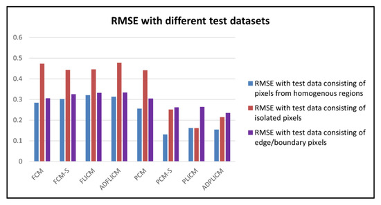 The global and class-wise RMSE values were estimated for outputs from each classifier (Table 4 and Figure 17). The PCM-based local spatial information classifiers, PCM-S, PLICM, and ADPLICM, exhibited lower RMSE values, which meant that there was less disparity between the output fraction images generated from these classifiers and the corresponding reference fraction images. Although the PLICM classifier was seen to be slightly advantageous over the other two algorithms in terms of global RMSE value, the class-wise RMSE for the Water class and visual interpretation suggested a significant loss in membership values for Water pixels with the PLICM classifier. To better analyze the performance of PCM-based local spatial information classifiers, RMSE calculation was repeated with test pixels from homogenous regions, noisy test pixels, and test pixels from borders and edges of the LULC classes (Figure 18). The RMSE values obtained in this case affirmed that the loss of image details was maximal in the PLICM classifier among the PCM-based local spatial information classifiers and minimal in the ADPLICM classifier. The RMSE values with noisy test pixels were, in general, lower for the PCM-based local spatial information classifiers, with PLICM producing the lowest value. The ADPLICM classifier was seen to perform better in retaining the image details among the PCM-based local information classifiers.