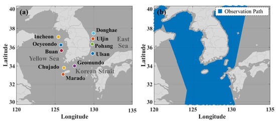 Study areas with (a) ten buoy locations and (b) an example of the ASCAT observation path on 2 January 2013.