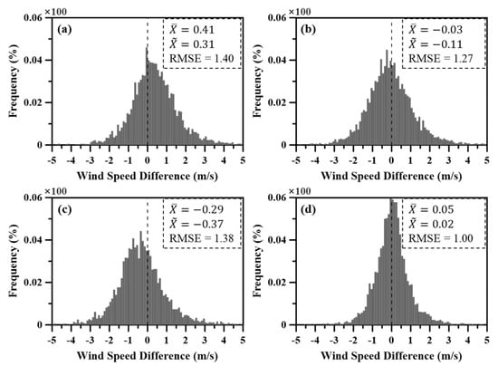 Histogram of the wind speed difference between the ASCAT-based and the in-situ wind speeds computed from the validation set: (a) Before calibration, (b) by linear regression-2 model, (c) by SVR approach, and (d) by DNN-4 model approach.