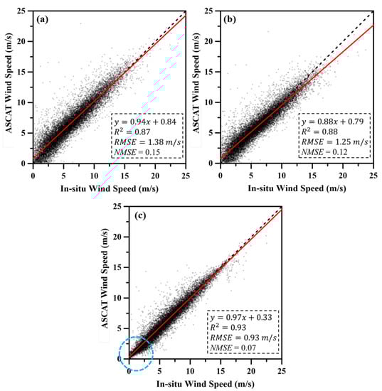 Scatter plot for comparison between ASCAT-based and in-situ measured wind speeds: (a) before calibration, (b) after linear regression-2 model-based calibration, and (c) after DNN-4 model-based calibration.