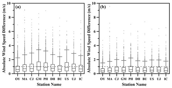 Deviations of absolute wind speed differences (i.e., absolute biases) at observation locations were evaluated. Results are presented in Figure 5 using a type of box plot with indications of the median, the first and third quartiles, and the minimum and maximum bounds excluding outliers. Before calibration, deviations of the speed difference were not consistent. They largely varied depending on the observation location (Figure 5a). Qualitatively, the median and the upper quartile values of the speed difference ranged from about 0.5 to 1.0 m/s and from about 1.1 to 1.7 m/s, respectively. In cases of Geomundo (GM), Pohang (PH), and Ulsan (US), located in the southeast part of South Korea, it was notable that statistical indicators were more deviated compared to those of other locations. After calibration, deviations of speed differences were reduced to be consistent over all observation locations (Figure 5b). The median and the upper quartile values of the speed difference were improved to encompass ranges of about 0.4~0.6 m/s and about 0.7~1.1 m/s, respectively. The results of such comparative analysis between observation locations revealed that the DNN method could calibrate ASCAT wind speeds more evenly and more accurately by reflecting local characteristics well.