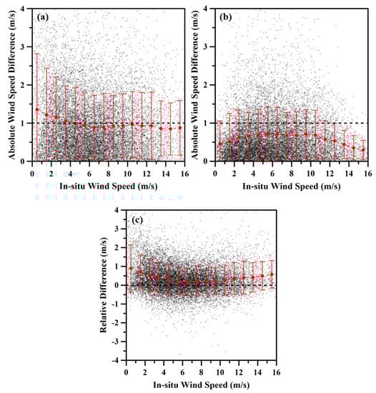 Next, to look into distribution of absolute wind speed differences over the wind speed range of interest, speed differences were calculated in bins of wind speeds of 1 m/s. Results are presented in Figure 6 and Table 4. Red dots and error bars in the graph denote mean and standard deviation of speed differences in each bin. At this time, wind speeds higher than 16 m/s were excluded from the analysis because the number of samples was less than 50. Before calibration, the mean of speed differences was evenly distributed at around 1 m/s, tending to increase at low wind speeds (less than 4 m/s) (Figure 6a). After calibration, these speed differences were largely reduced over the full speed range of interest (less than about 0.7 m/s). In particular, bins of low wind speed (less than 4 m/s) and high wind speed (11 m/s) were greatly improved with much lower mean and standard deviation values, as shown in Figure 6b. It is known that ASCAT wind speeds tend to have larger errors in lower and higher wind speeds [36,37]. However, this problem was solved using the DNN method in this study. Nevertheless, the calibration was insufficient for the wind speed of 4–11 m/s, which is thought to be due to some overestimated results during the calibration process (Figure 6c).
