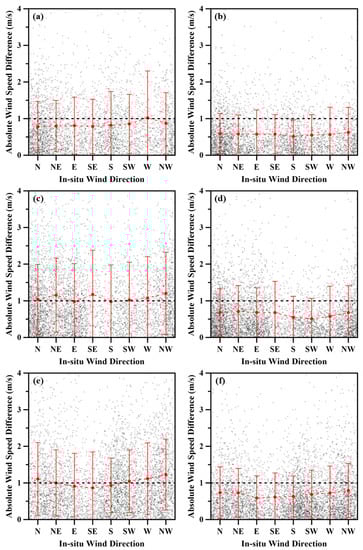 The mean and standard deviation of wind speed differences (△WS) at each wind direction bin.