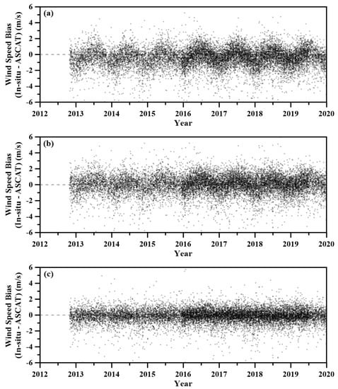 In the QC process of the ASCAT and the buoy data, a standard deviation-based threshold was used to remove outliers. Unrealistic negative values were also removed. In addition, ASCAT wind speeds larger than 25 m/s were removed because that speed range of the ASCAT wind data could considerably decrease accuracy [35].