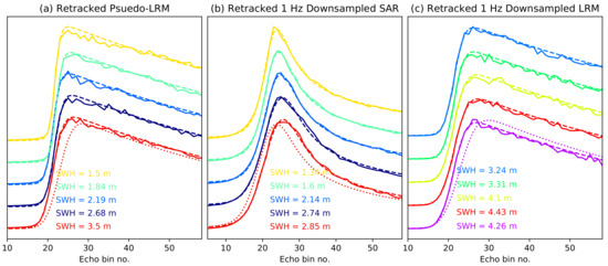 Example power waveform fit for (a) pseudo-LRM echoes (b) coincident 1 Hz down samples SAR echoes and (c) 1 Hz downsamples LRM echoes. Note that plots a and b originate from the same level 1 SAR retrievals. Each waveform (solid line) is plotted alongside an optimised 3 parameter fitted semi-analytic wave (dashed line) with the associated SWH listed. All waves are normalised by peak power and plotted at increasing height for clarity. The bottom most wave also has a 1 parameter (SWH only) matched wave plotted alongside (dotted line). The location of each wave is plotted in the same colors in Figure 2.