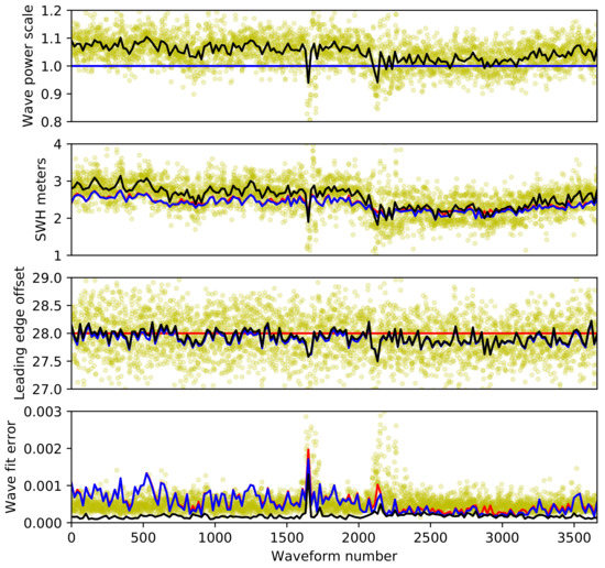 Comparison of the three methods of waveform fitting for 1 Hz downsampling over a section of satellite track in the North Atlantic. Red: fitting of (SWH) only, blue: and (waveform leading edge), black: , and A (waveform power scale). These results are compared to a three parameter fit of each individual 20 Hz waveform (yellow scatter). Retrieved (or default values) of wave power scale, SWH and waveform leading edge are plotted, along with the fit error between the the original and optimal semi-analytical waveform.