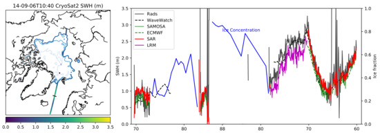 Significant wave height and ice concentration 6 September 2014 12:11. To the left is the map of the Arctic with NSIDC ice concentration contours of 15%, 50% and 85%. We plot our retrieved SWH from SAR and LRM modes, with the transition indicated by the black line. To the the right is the detailed SWH for the track from our new data (SAR and LRM modes), RADS (pseudo-LRM and LRM modes), SAMOSA (SAR mode) and the WaveWatch 3 and ECMWF wave models. For the regions where the orbit track intersects the sea ice cover the ice concentration is plotted. Note that the plotted latitude is symmetrical about 88N, the northern limit of the CS2 orbit.